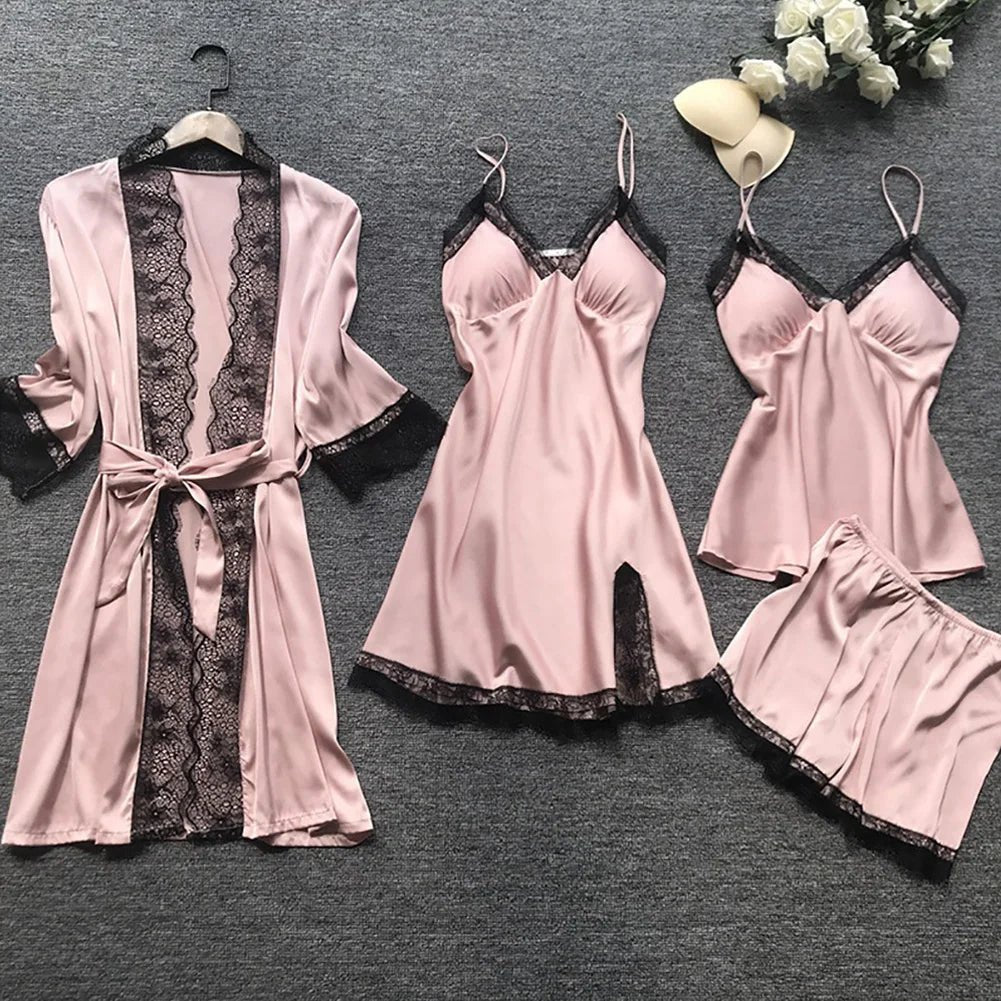 Seksowna Bielizna Nocna Damska 4-częściowa – Szlafrok, Koszulka, Top i Szorty z Koronką