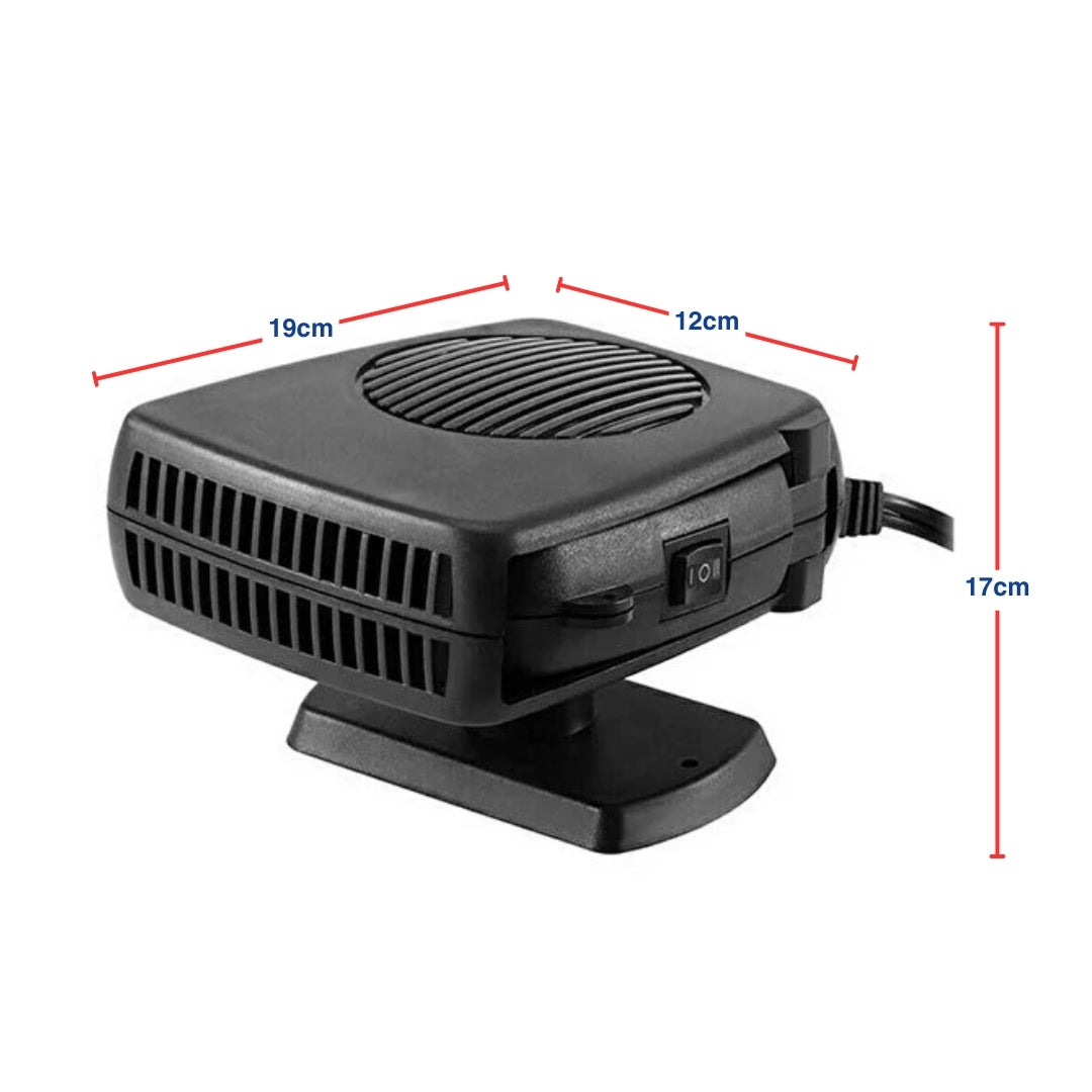 Ogrzewacz ma wymiary około 19 × 12 × 17 cm, a przewód zasilający mierzy około 140 cm, co ułatwia ustawienie go w wygodnym miejscu w większości kabin samochodów.