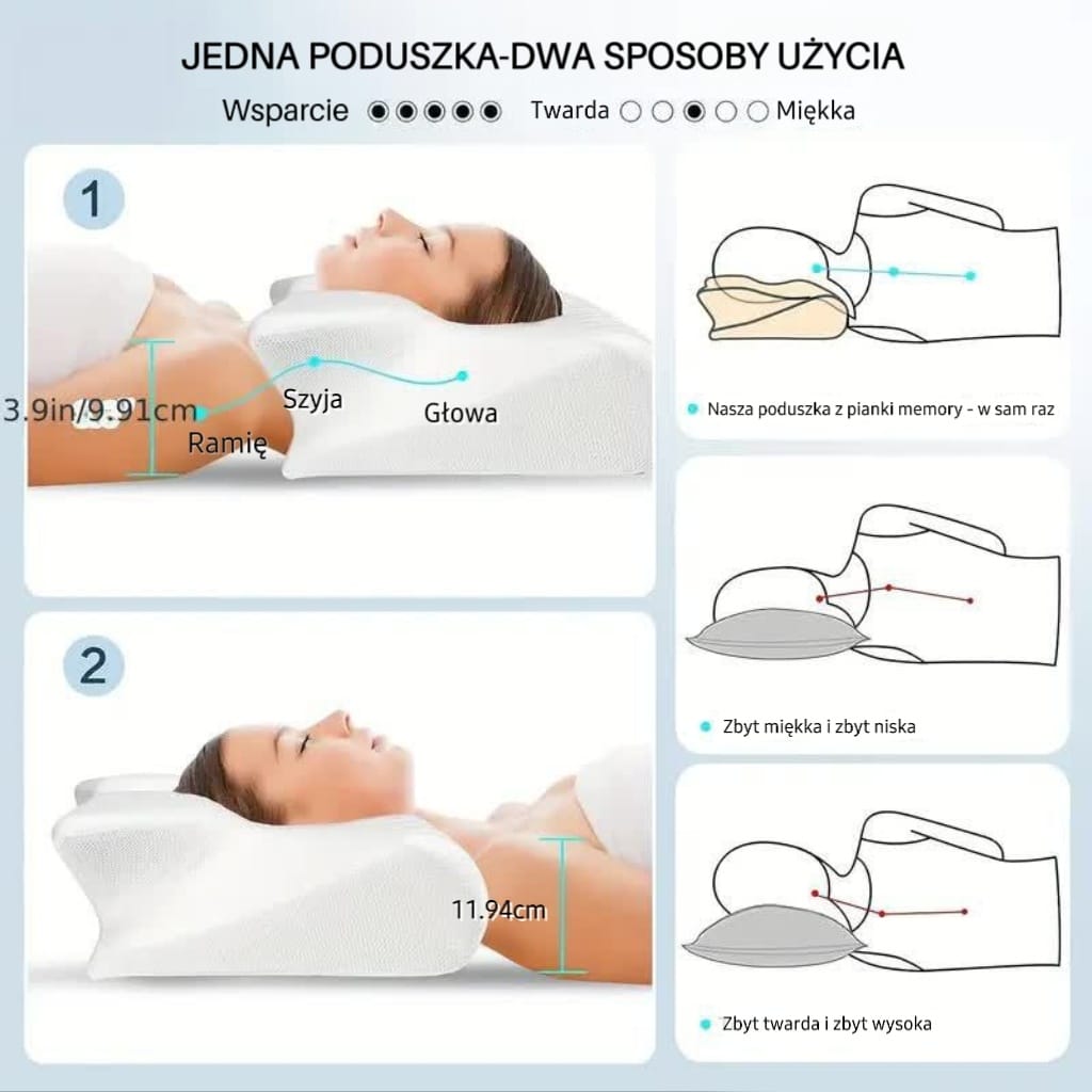 • Ergonomiczny kształt: Idealne dopasowanie do głowy i szyi, wspierające zdrową pozycję podczas snu.