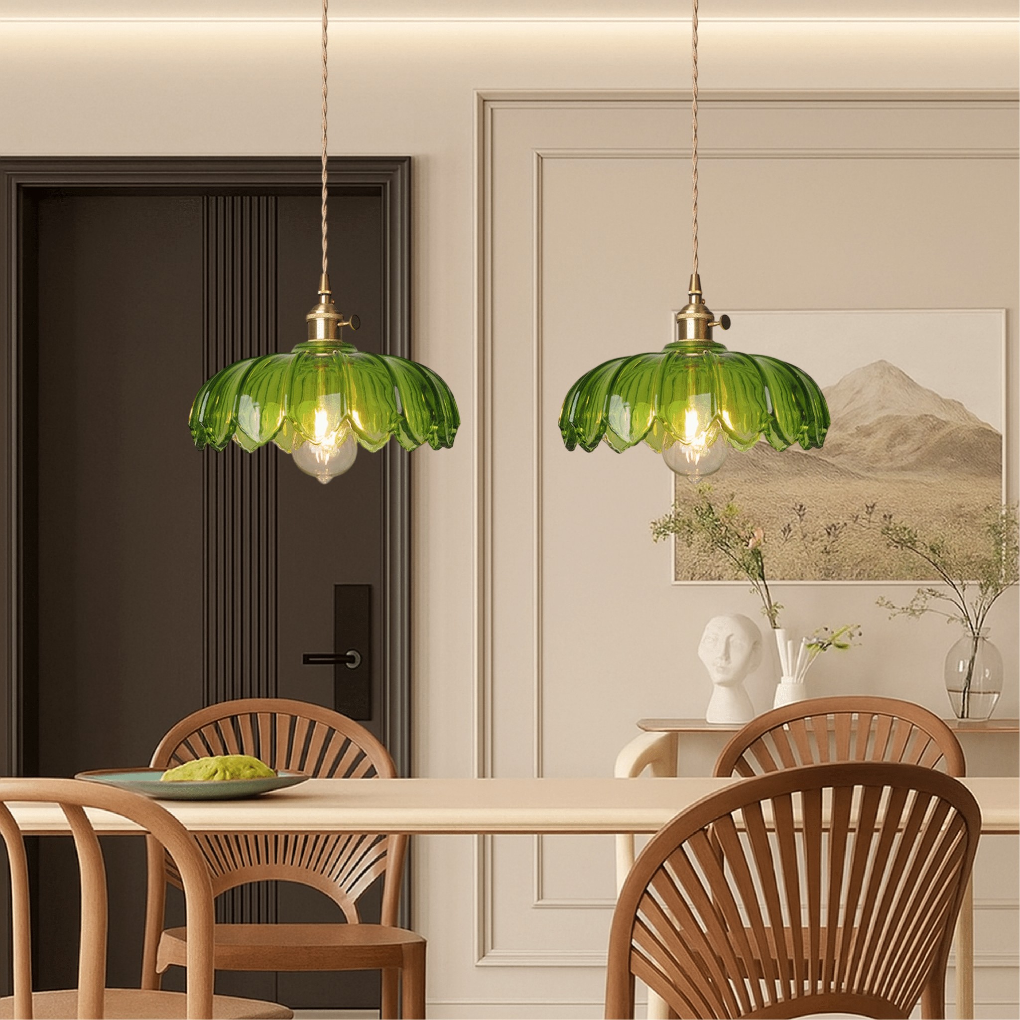 Odkryj elegancką lampę wiszącą ze szklanym kwiatem, która doskonale wpasuje się w nowoczesne wnętrza. Dzięki rzeźbionym kloszom w odcieniach bursztynu i zieleni, ta lampa łączy w sobie prostotę i styl vintage, tworząc przytulną atmosferę w jadalni lub barze.